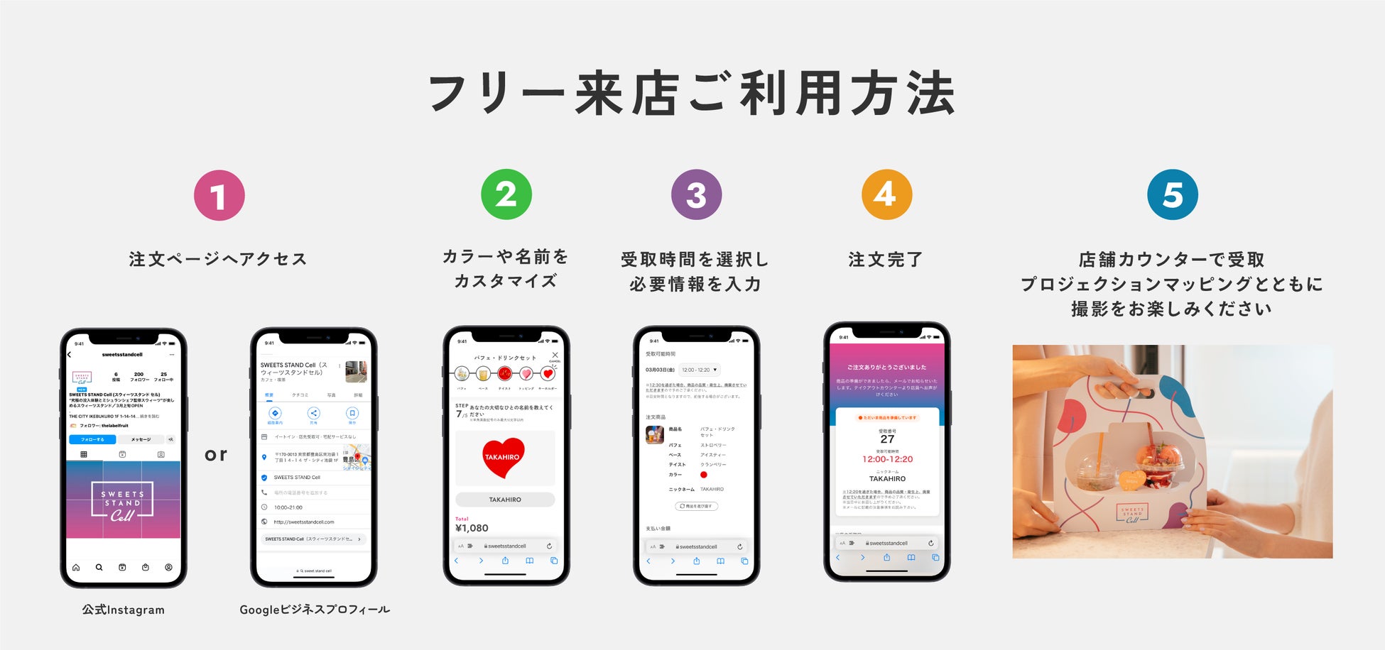 ・公式注文ページ(https://order.sweets.the-label.jp/restaurants/1612792935138124800/menus/0)へアクセス(店舗に着いてからでも注文可)