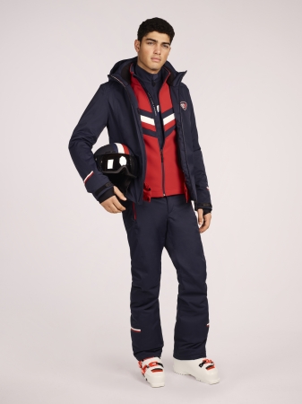 ネイビースキージャケットとパンツ:4wayストレッチ、保温効果、シームシーリング、DWR加工、“ヒルフィガー”グラフィックが入ったフード、フロントには小さなロシニョールロゴ、ミニグローバルストライプデザイン