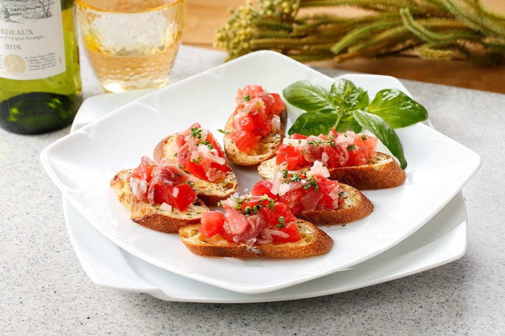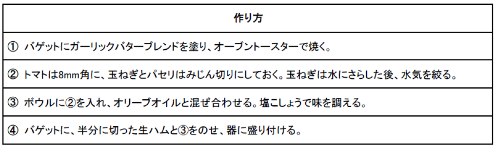 ④バゲットに、半分に切った生ハムと③をのせ、器に盛り付ける。