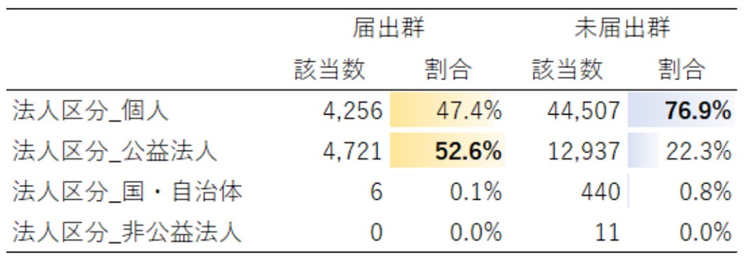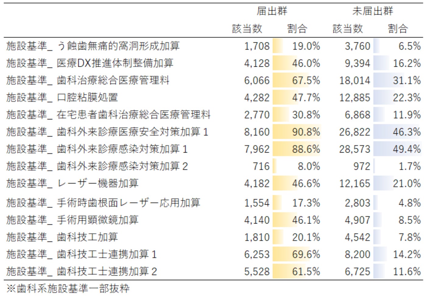 2024年9月時点で「光学印象」の届出を確認できた8,983施設(以降「届出群」)と、届出がなかった57,895施設(以降「未届出群」)の診療所属性を比較し、両群間の割合差が大きな項目を抽出しました。