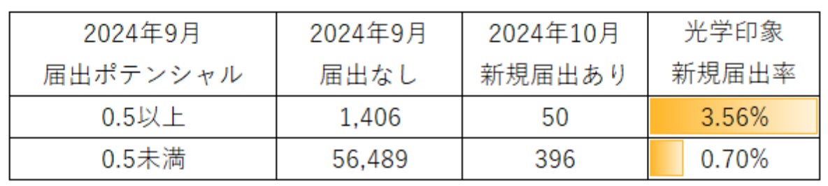 2024年9月時点の診療所属性から「光学印象」の導入ポテンシャルを予測した結果と、2024年10月時点の「光学印象」新規届出状況を比較したところ、9月時点で「光学印象」の届出がなく、同時点の「光学印象」の届出ポテンシャル0.5以上(※1=届出有)の診療所1,406件のうち、10月に実際に「光学印象」の届出が確認された診療所は50件(3.6%)でした。一方、9月時点で「光学印象」の届出がなく、同時点の「光学印象」の届出ポテンシャル0.5未満の診療所56,489件について、10月に「光学印象」届出が確認されたのは396件(0.7%)に留まり、予測から1か月後の検証結果において、ポテンシャル要因保有診療所では「光学印象」の届出が行われる可能性が相対的に高い傾向が示唆されました。