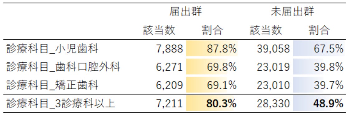 「光学印象」届出群は、小児歯科・歯科口腔外科・矯正歯科など複数の歯科診療科目を掲げている診療所が多く、3診療科以上標榜している診療所が約8割でした。一方、未届出群で3診療科以上標榜している診療所は半数未満に留まりました。