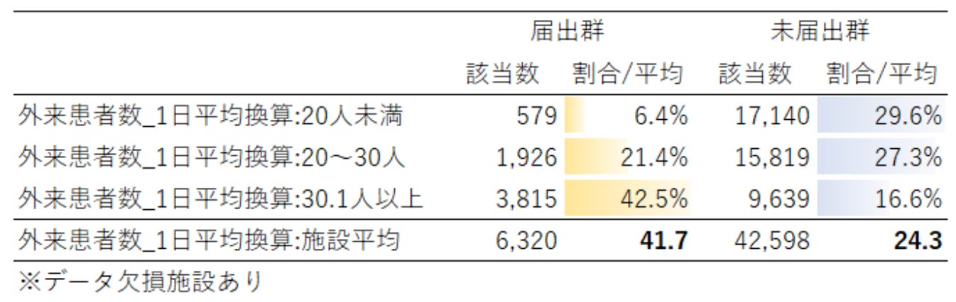 「光学印象」届出群の約4割は1日平均外来患者数が30人を上回っており、平均41.7人でした。一方、未届出群は1日平均外来患者数が30人以下である診療所が半数以上を占め、平均24.3人でした。