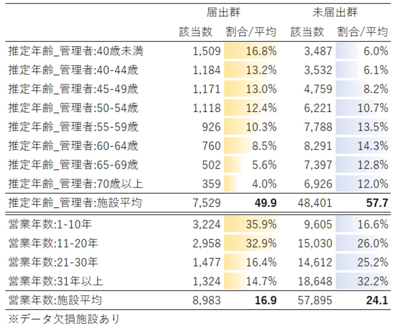 管理者(院長)の推定年齢は、届出群の平均49.9歳、未届出群の平均57.7歳で届出群の方が8歳程若い傾向が見られました。同様に営業年数も、届出群の平均16.9年、未届出群の平均24.1年と届出群の方が7年程新しい診療所である傾向が見られました。