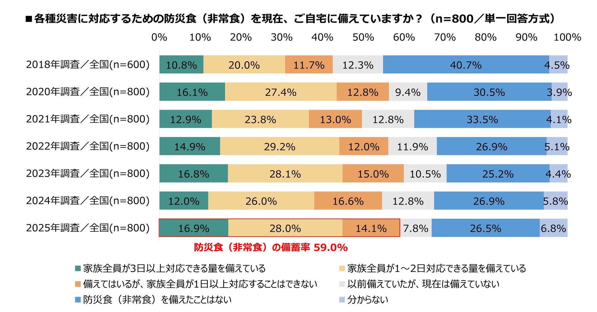 -2025年度 家庭の防災対策実態調査- 防災食備蓄率は59.0%、コスト要因で備蓄断念 約3割に増加 ローリングストックの活用 24.6%で過去最高を記録