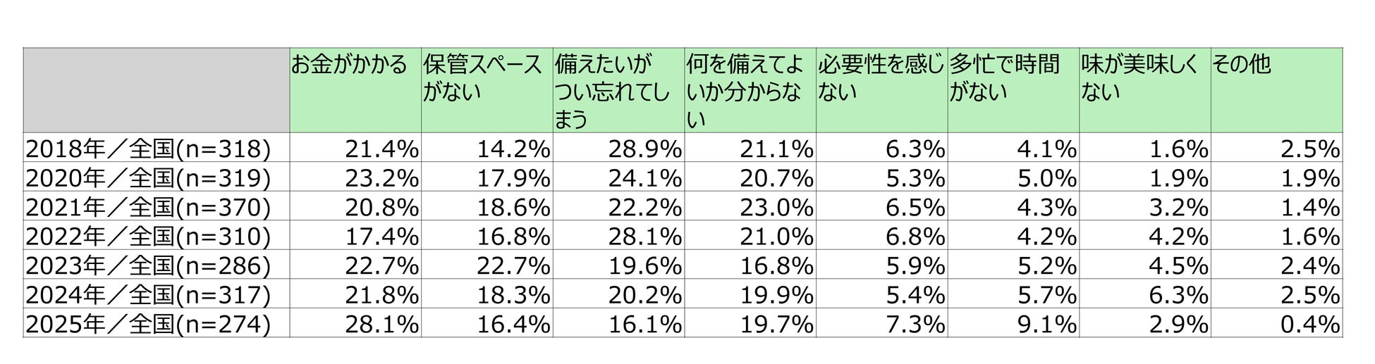 備蓄見送りの理由、費用面が最多 ローリングストックも費用の問題は継続課題