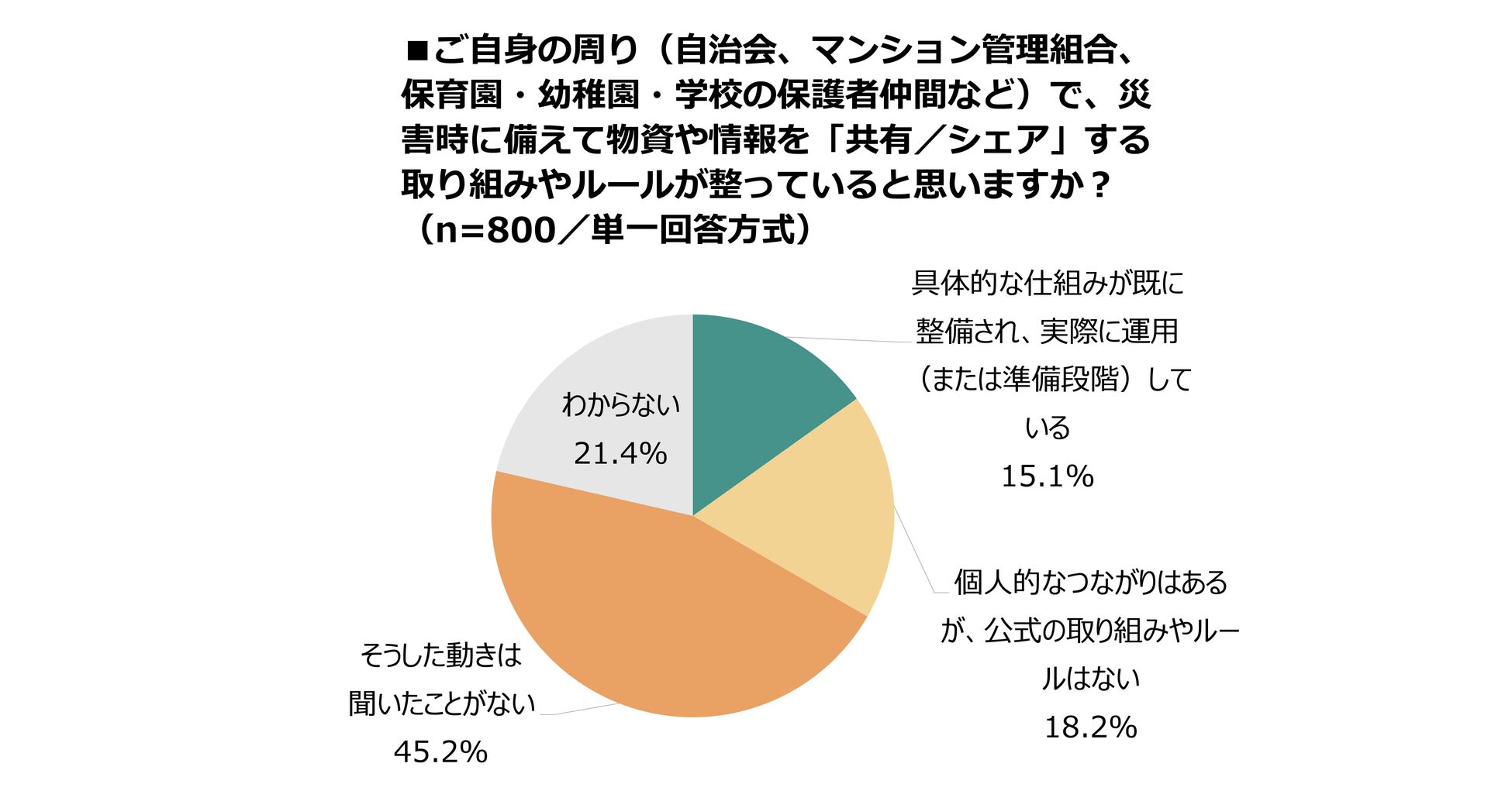 近年、新たな防災課題として災害時の共助体制も挙げらます。そこで、災害時に備え、自治会や保育園・幼稚園、学校などの保護者仲間など自身の周りで、防災物資や情報を「共有/シェア」する取り組みやルールが整っているかを聞いたところ、「具体的な仕組みが既に整備され、実際に運用(または準備段階)している」と回答した方は15.1%にとどまりまり、新たな防災課題として浮き彫りとなりました。