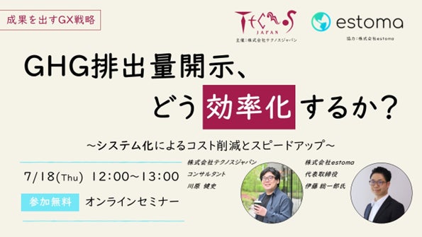DXでつながる社会の未来を切り拓く株式会社テクノスジャパン(本社:東京都新宿区、代表取締役 社長執行役員:吉岡 隆、証券コード:3666、以下「テクノスジャパン」)は、株式会社estoma(本社:東京都千代田区、代表取締役:伊藤 総一郎、以下「estoma社」)と、『【成果を出すGX戦略】GHG排出量開示、どう効率化するか?~システム化によるコスト削減とスピードアップ~』と題する無料Webセミナーを、2024年7月18日(木) 12:00~13:00に開催いたします。