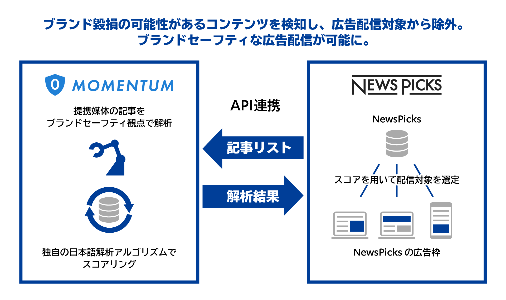 「NewsPicks」にHYTRA APIを連携させ、提携媒体の記事コンテンツをモメンタム独自の日本語解析技術によりスコアリングし、広告主のブランド毀損が懸念されるような記事には広告を表示しないよう制御することで、良質な広告枠のみを増設することができました。