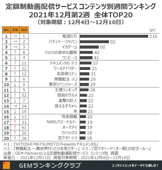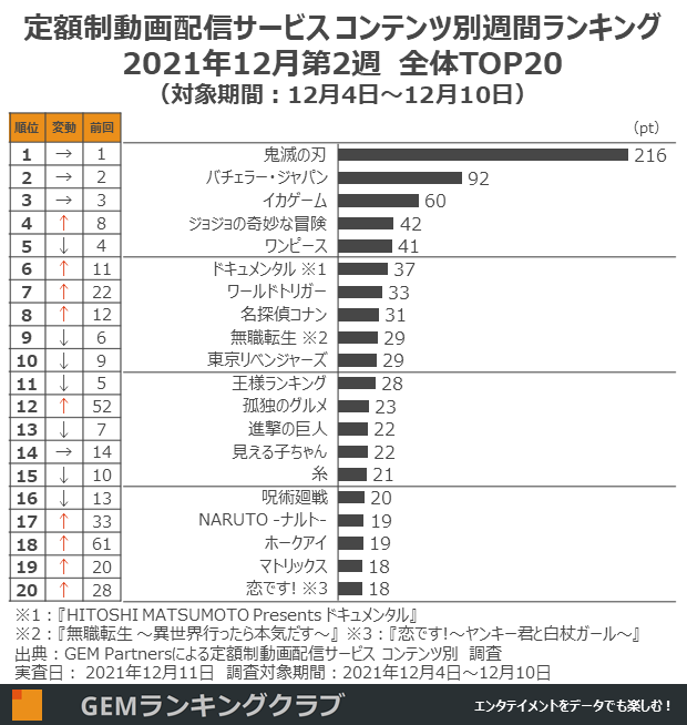 エンタテイメント業界に向けたデータ×デジタルマーケティングサービスを提供するGEM Partners株式会社(ジェムパートナーズ、所在地:東京都港区、代表取締役:梅津文)は12月17日(金)、エンタメコンテンツランキングやデータ情報を発信する「GEMランキングクラブ」プロジェクトにて作成した2021年12月第2週の「定額制動画配信サービス コンテンツ別週間ランキングTOP20(実査日:12月11日、調査対象期間:12月4日~12月10日)」を発表いたします。