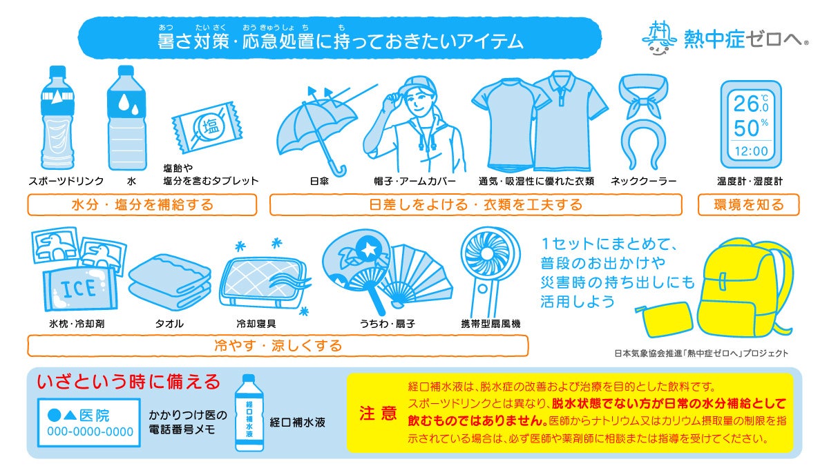 熱中症予防・対策につながる行動を生活に組み込みましょう。まずは自分のいる環境や熱中症に関する知識を積極的に集めましょう。また暑さ対策グッズや、いざという時に備えて応急処置のアイテムも一式揃えておくと安心です。普段の外出の持ち物に加えたり、災害時の非常用持ち出し袋に追加したり、夏場や暑い日ならではの対策セットを小分けに作っておくこともおすすめです。エアコンは、必要なタイミングで「すぐに」「効率的に」使えるよう、事前の点検も忘れないようにしましょう。