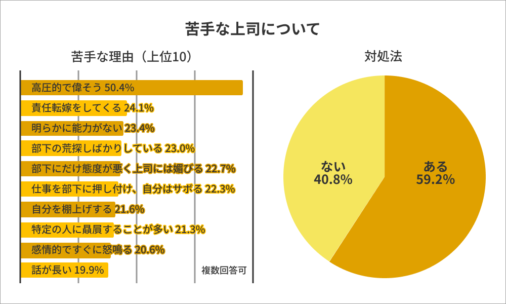 苦手な理由について最も多い回答だったのは「高圧的で偉そう」50.4%で、次いで「責任転嫁してくる」が24.1%、「明らかに能力がない」が23.4%で上位3つの回答結果になり、最も少ない回答だったのは「話が長い」19.9%の結果になりました。また、苦手な上司への対処法有無については59.2%が「ある」と回答し「ない」は40.8%に結果でした。(苦手な理由についての属性別など詳細は別途まとめています https://job-q.me/articles/13532 )