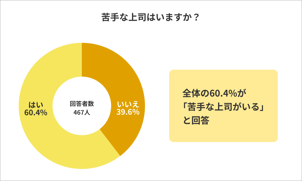 | 【TOPICS】 ・全体の60.4%が「苦手な上司がいる」と回答 ・最も苦手な上司は「同性の年上」が最多回答 ・苦手とする理由は「高圧的で偉そう」が半数超で最多回答 ・全体の59.2%が苦手上司に対して「対処法がある」と回答 ・全体の半数が上司に期待していることは「ない」と回答 |