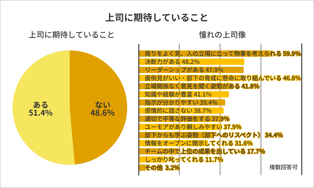 上司への期待有無について聞くと、全体の半数51.4%が「期待していることがある」と回答しました。また、自身が憧れる上司像については全体の59.9%が「周りがよく見えていている」で最多回答になり、次いで「決断力がある」48.2%、「リーダーシップがある」47.9%で、上位3つの回答結果になりました。これを年代別で見ると憧れの上司像の違いが顕著に見られましたので下記リンクにてランキング形式でまとめています。