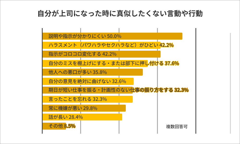 自分が上司になった時に真似をしたくない言動について全体の50.0%が「説明や指示がわかりづらい」で最多回答になり、次いで「ハラスメンがひどい」が42.2%、「指示がコロコロ変化する」42.2%で上位3つの回答結果になりました。回答が少なかったのは下から「話が長い」28.4%、「常に機嫌が悪い」29.8%、「言ったことを忘れる」32.3%、でした。