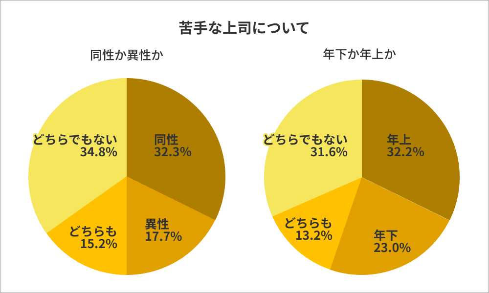 苦手な上司の在否については、全体の60.4%が「苦手な上司がいる」と回答し「いない」は39.6%の結果になりました。また苦手とする上司の性別では「同性」が32.3%で「異性」が17.7%、「どちらも苦手」が15.2%の回答結果になりました。さらに上司の年齢で苦手意識を見ると、「年上」が32.2%で「年下」が23.0%、「どちらも苦手」が13.2%という回答結果になり、全体的に最も苦手とする上司は「同性で年上」の結果になりました。