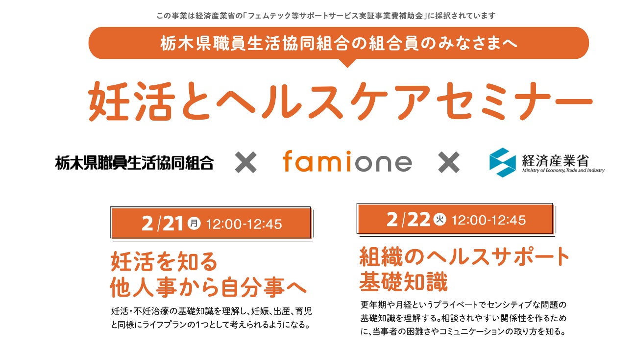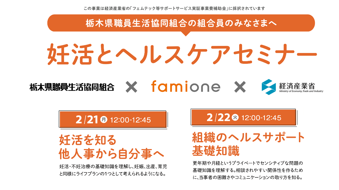 「子どもを願うすべての人によりそい 幸せな人生を歩める社会をつくる」をビジョンに掲げ、LINEを活用した妊活コンシェルジュサービス「famione(ファミワン)」 https://lp.famione.com/ を提供する株式会社ファミワン(本社:東京都渋谷区、代表取締役:石川 勇介、以下当社)は、経済産業省 令和3年度「フェムテック等サポートサービス実証事業費補助金」における補助事業者に採択された取り組みとして、栃木県職員生活協同組合の組合員を対象としたセミナーを開催します。
