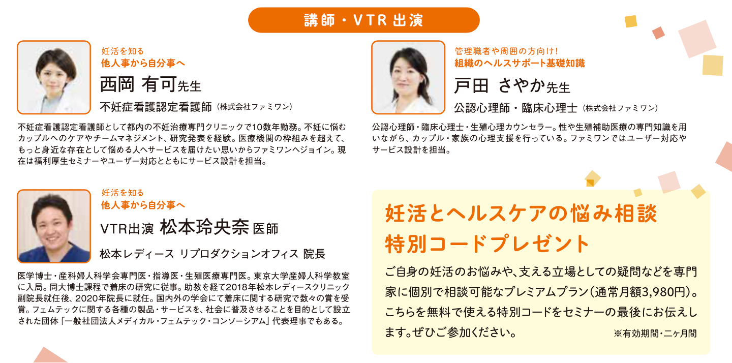 また、参加した方へはご自身の妊活のお悩みや、支える立場としての疑問などを専門家に個別で相談可能なプレミアムプラン(通常月額3,980円)を二ヶ月間無料で使える特別コードをセミナーの最後にお伝えする予定です。