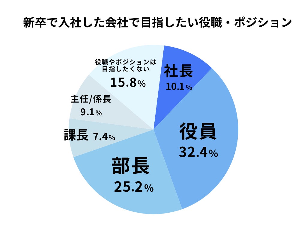 入社した会社で目指したい役職・ポジションを尋ねたところ、「役員」(32.4%)が最多となり、「部長」(25.2%)、「社長」(10.1%)の回答を合算をすると67.7%の学生が経営幹部のポジションを目指したいと考えていることがわかりました。