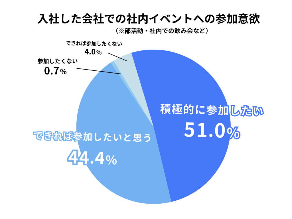 入社した会社の社内イベントに参加をしたいかを尋ねたところ、「積極的に参加したい」(51.0%)、「できれば参加したいと思う」(44.4%)を合算すると95.4%が参加に意欲的であるということがわかりました。