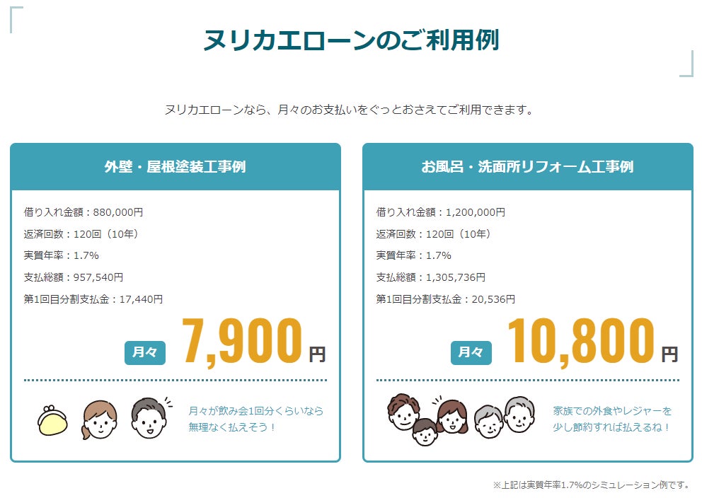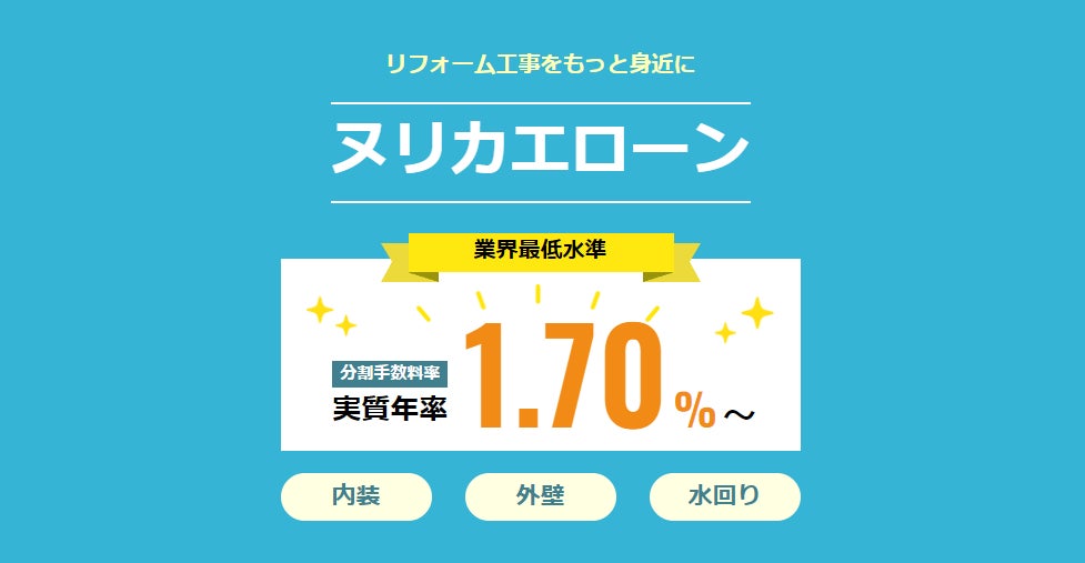 「ヌリカエローン」はヌリカエ経由でリフォーム(内装・水回り・外装)を行う全てのユーザーのご利用が可能となっています。業界最低水準1.70%~の提供により、リフォーム料金の負担を軽くすることを実現します。