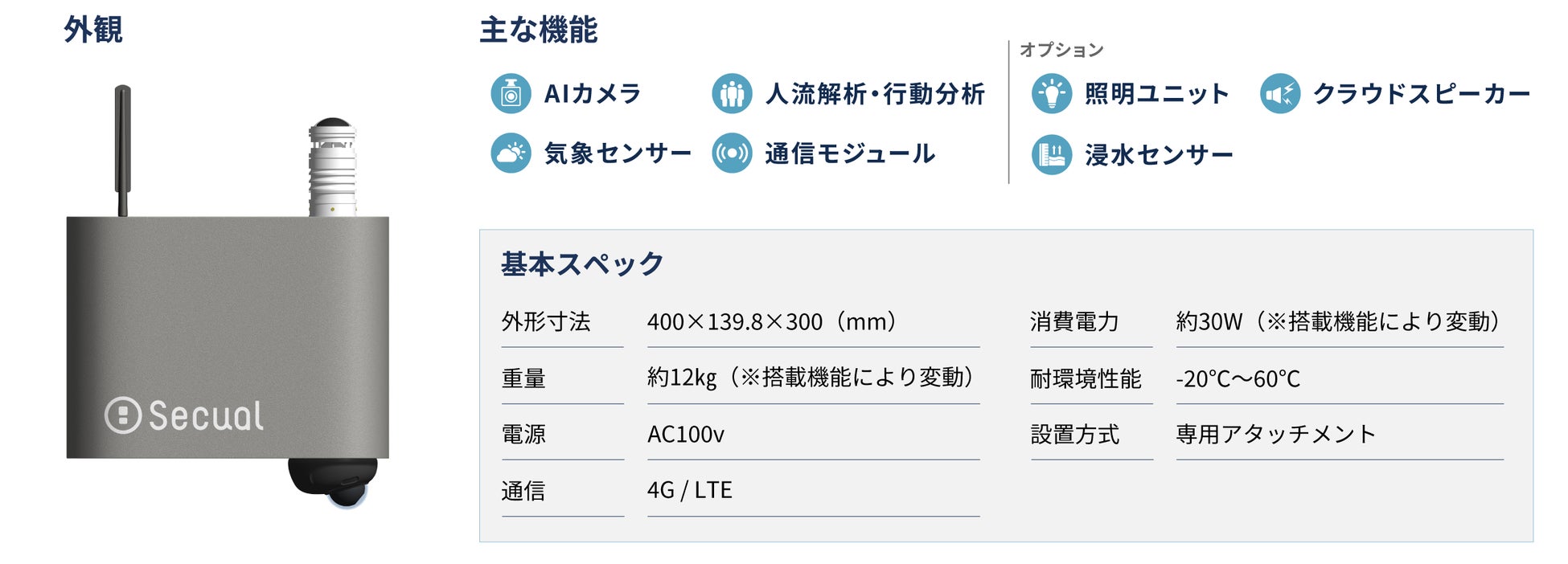 Secual Smart Podは、都市部での安心・安全機能の提供やスマート化への貢献のみならず、カメラ、気象センサー、浸水センサー、スピーカーを組み合わせた防災分野利用や、河川や湾岸エリアの監視、工場や物流施設の屋内外の見える化、観光地・イベント会場での気象観測や人流解析など、多様なシーンでの活用が期待されています。