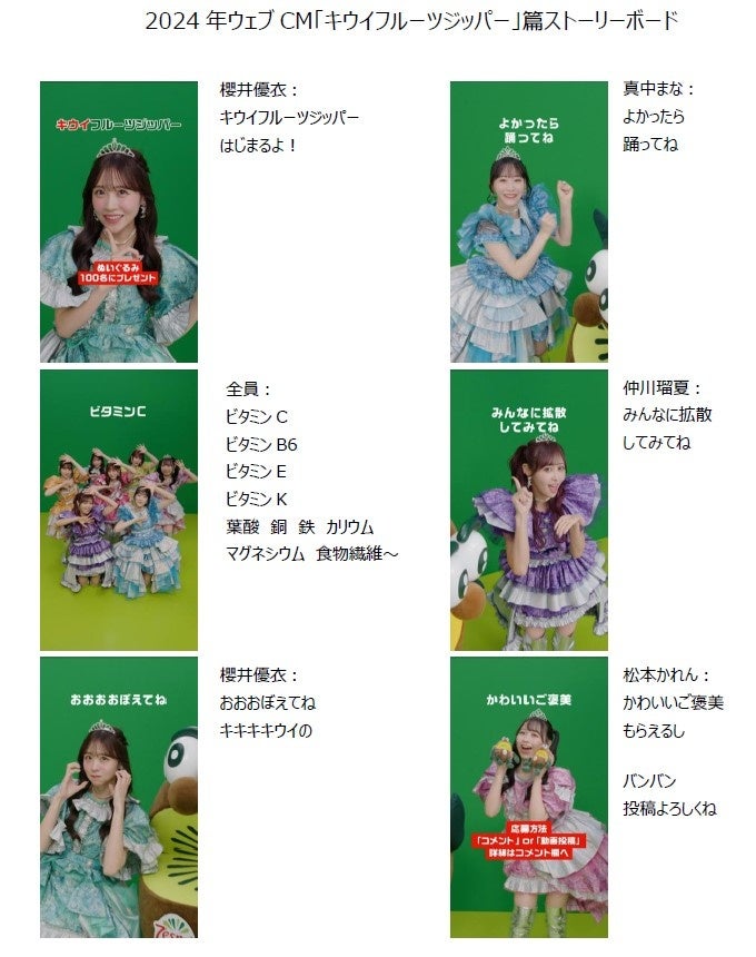 ウェブCMには大注目の7人組アイドルグループ・FRUITS ZIPPERを起用。動画ではグループ名の「FRUITS ZIPPER」改め、「キウイフルーツジッパー」として、キウイブラザーズと共にビタミンCや食物繊維、カリウムなど、日常生活で積極的にとりいれたい10種の栄養素が含まれたゼスプリキウイの魅力をオリジナルソングとダンスで披露します。