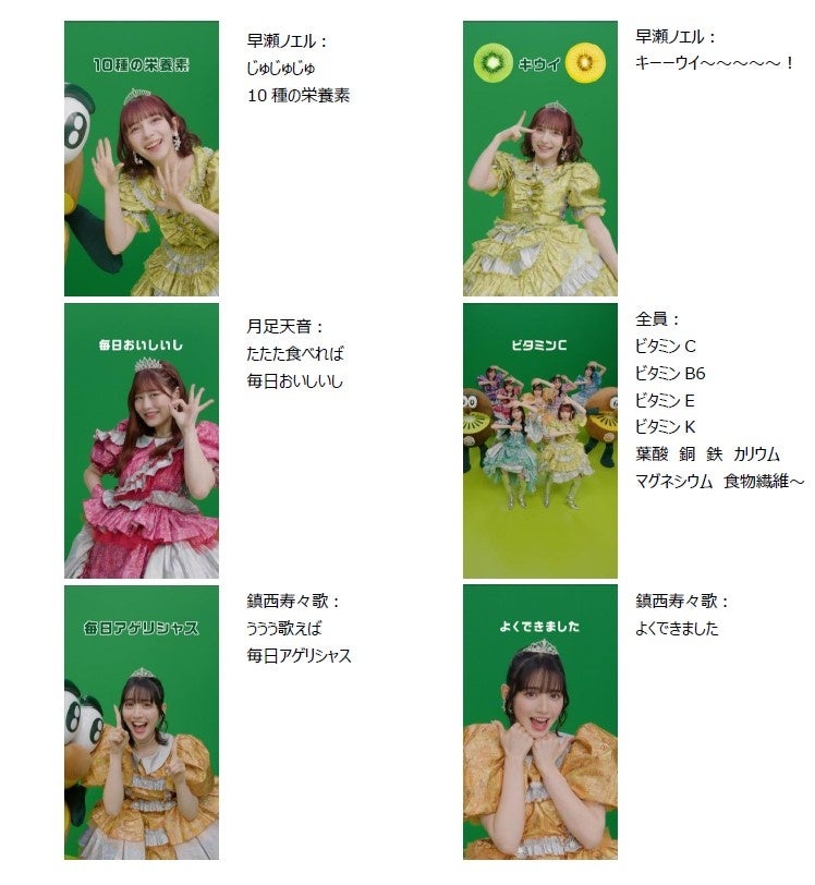 「キウイフルーツジッパー、はじまるよ!」と呼びかける櫻井さんが登場。その後、キウイフルーツジッパーが全員でテンポの速いキレのあるダンスを披露しながら「ビタミンC~♪」とキウイフルーツに含まれる10種の栄養素を歌い上げます。途中ソロパートもあり、メンバーがキウイブラザーズのグリーンとゴールドと一緒に踊りながらキウイフルーツの魅力をアピール。最後には、鎮西さんが「よくできました!」と締めくくる内容となっております。
