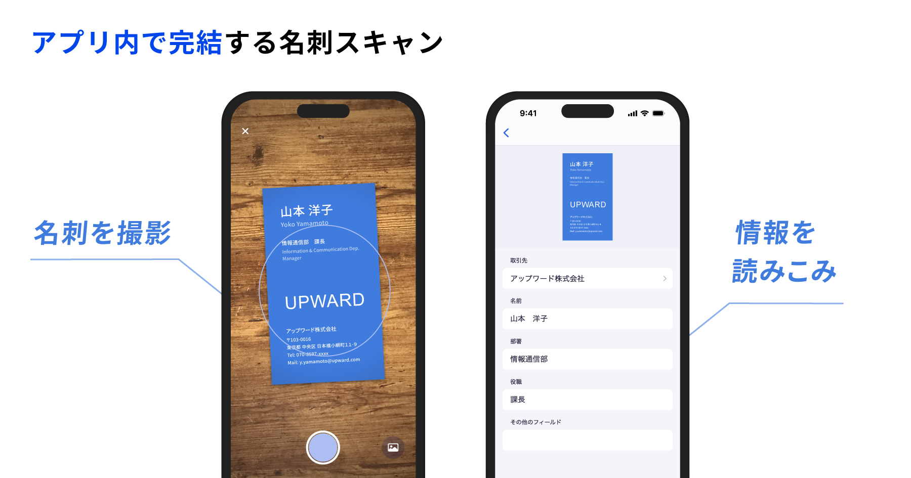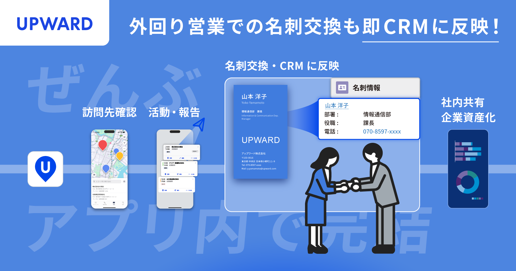 名刺スキャン機能の追加により「UPWARD AGENTモバイルアプリ」1つで、外回り営業に必要な一連の業務をこれまで以上にワンストップで実施できます。