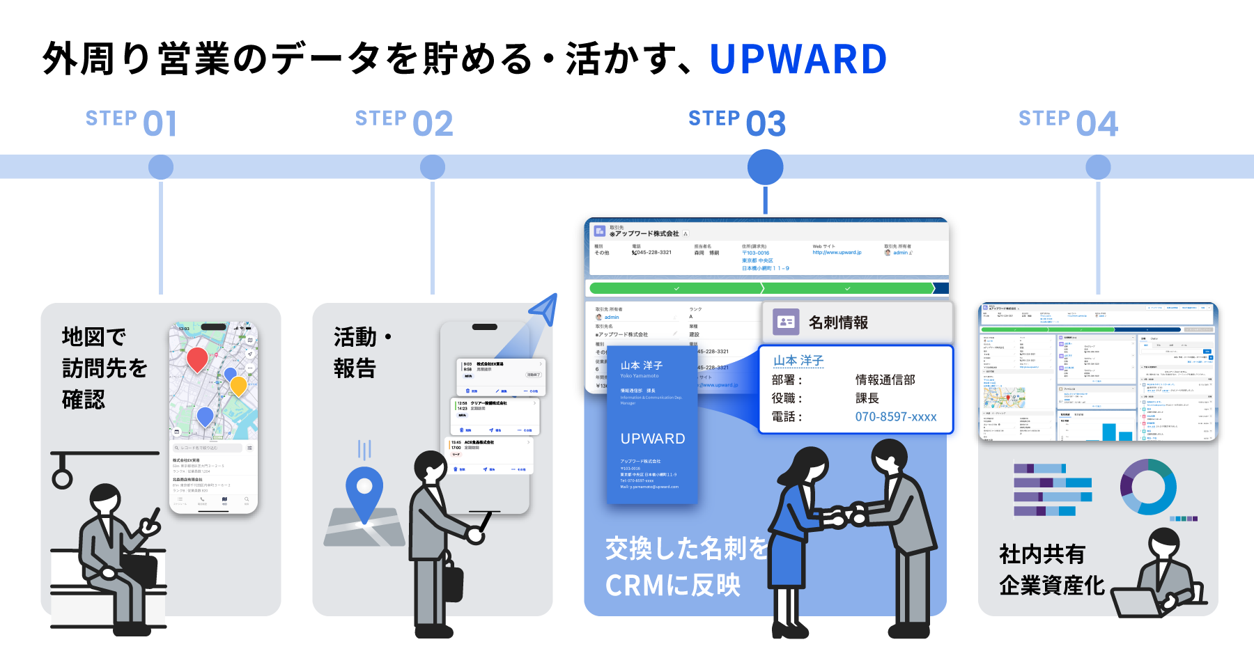 UPWARDはCRM・SFAの価値を最大化する「セールスエンゲージメント」を実現するアプリです。顧客データを“貯める・活かす”ことを軸に、SalesforceやMicrosoft Dynamics365といったクラウドCRMと連携し、外回り・訪問営業の方々がより創造的に働けるよう、多様なサポート機能を提供します。