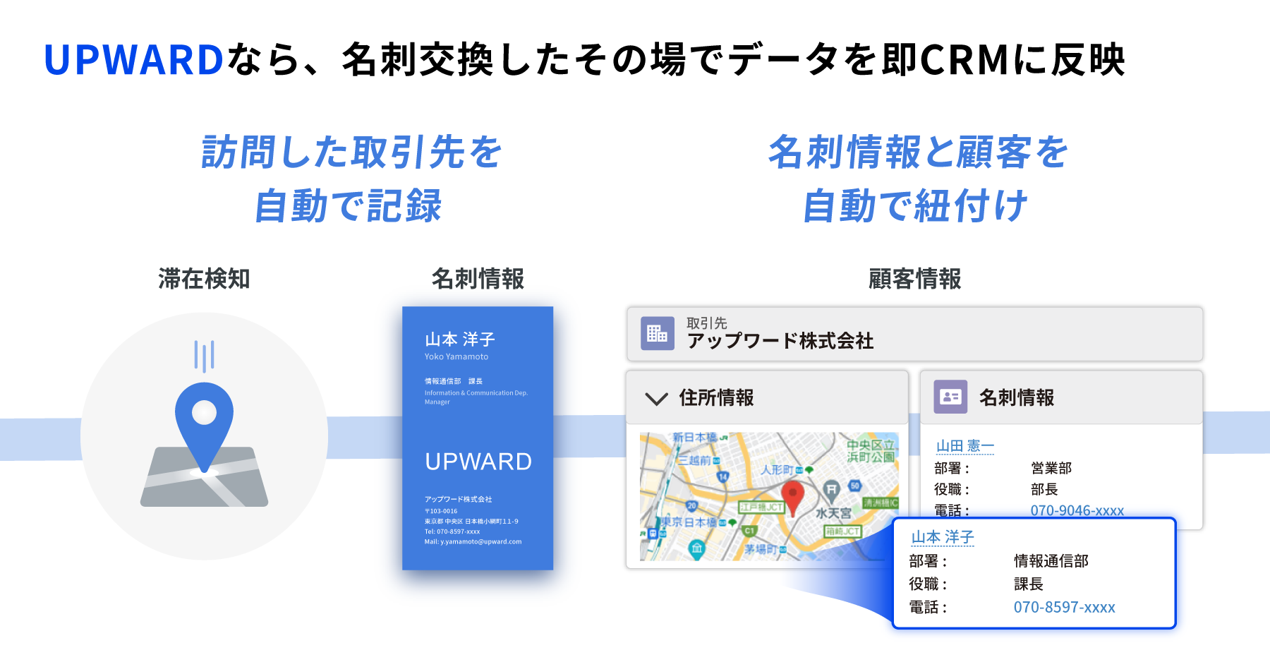 「UPWARD AGENTモバイルアプリ」では顧客情報の地図表示や、特許技術である滞在検知によるスマホでの簡単な活動報告を実現しています。今回の新機能によりさらに、訪問時に交換した名刺情報の登録も行えるようになり、訪問に伴う業務が全て一つのアプリ内で完結するようになるため、さらなる営業活動の効率化につながります。