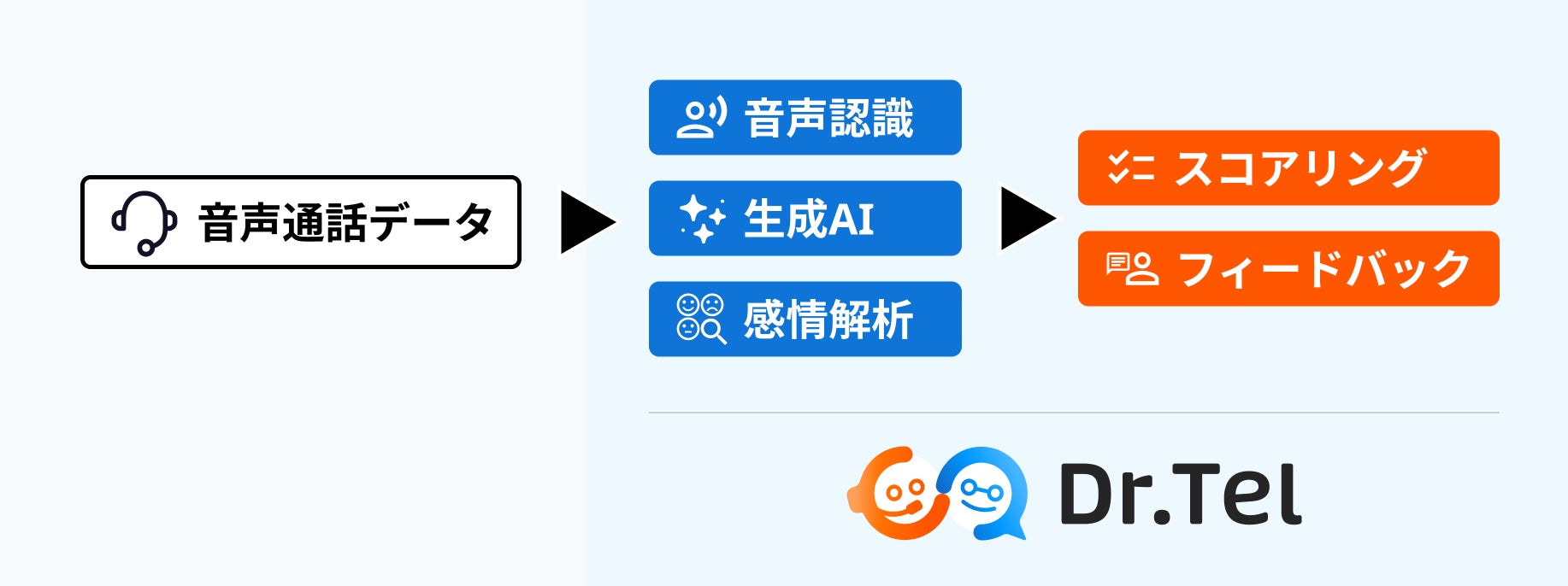 これまで評価者の主観に頼らざるをえなかった「顧客満足度」や「オペレータの与える印象」に関する評価をDr.Telが代替することで、評価者の工数を大幅に削減するだけでなく、客観的評価による納得感の向上や評価頻度の大幅な増加が可能になります。