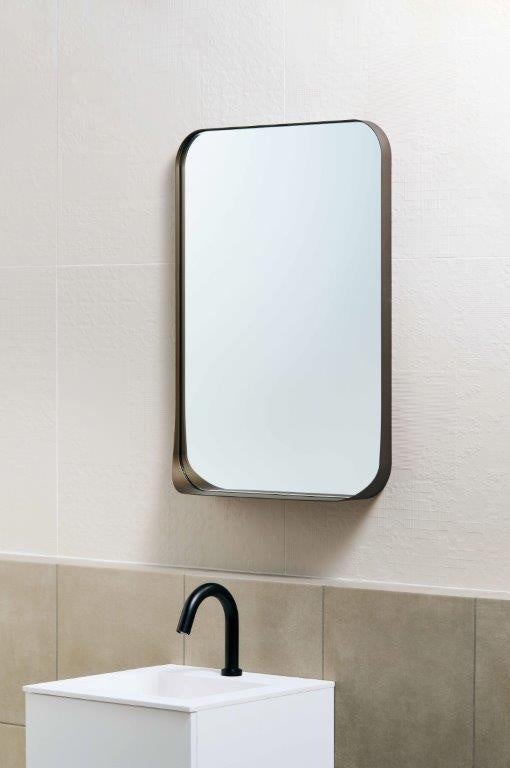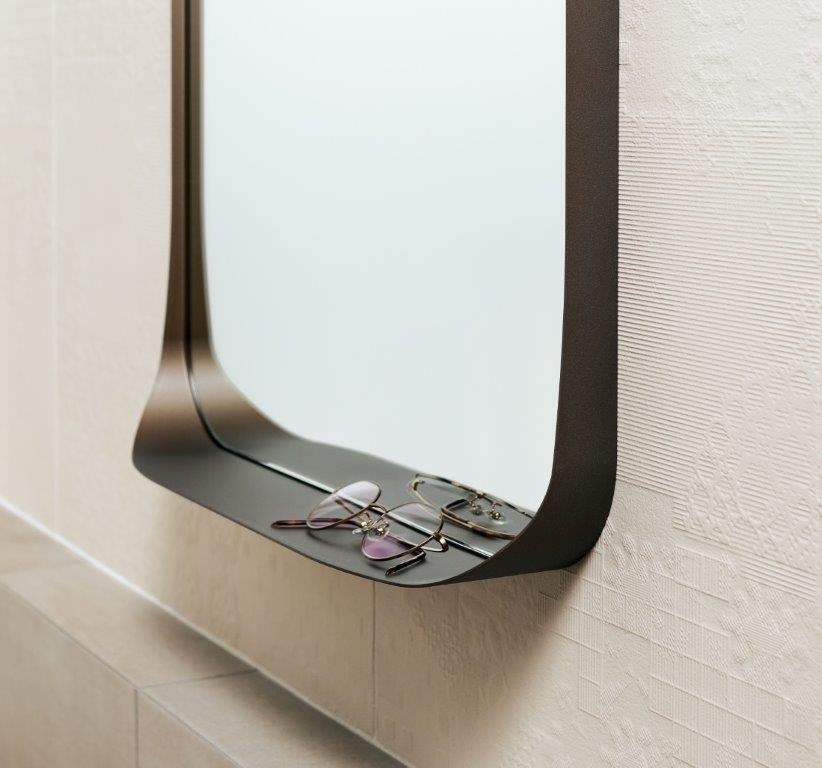 《アールミラー》は、やわらかく有機的なフォルムが特長のミラーです。薄いフレームでシャープさを演出し、四隅の曲線デザインでやわらかさをプラスしました。フレームと一体化したシェルフ部分は、洗面周りの小物を置くのに便利です。トレンドのエイジドメタル(経年変化した金属)をイメージした2色展開で、住まいのあらゆる空間に調和します。