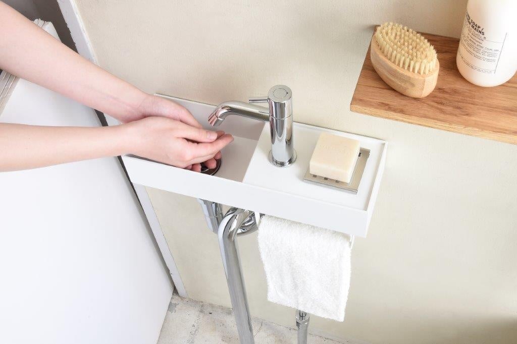 《テハチ》は、世界最小クラスのコンパクトさを追求した手洗器です。ボウル・カウンター・タオルバーを一体化し、シンプルで直線的なデザインにまとめました。奥行き120mm×横幅350mmとスリムなため、住宅や店舗・公共施設のちょっとしたスペースに設置が可能です。