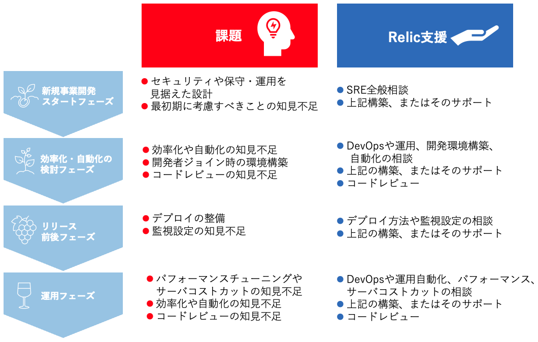 本サービスにおいてRelicは、SREを基軸とした開発から運用の過程で生じる「何を、いつ、どのようにすればいいのか」という悩みを最小限で解決するように目指す「SRE as a Service」を提供いたします。新規事業開発において、SRE、インフラの保守運用、セキュリティ対策、DevOpsをどこまでやるのかをサービスや事業計画に寄り添う形で、伴走型やメンタリングの形でサポートし、必要に応じて構築のサポートなども致します。