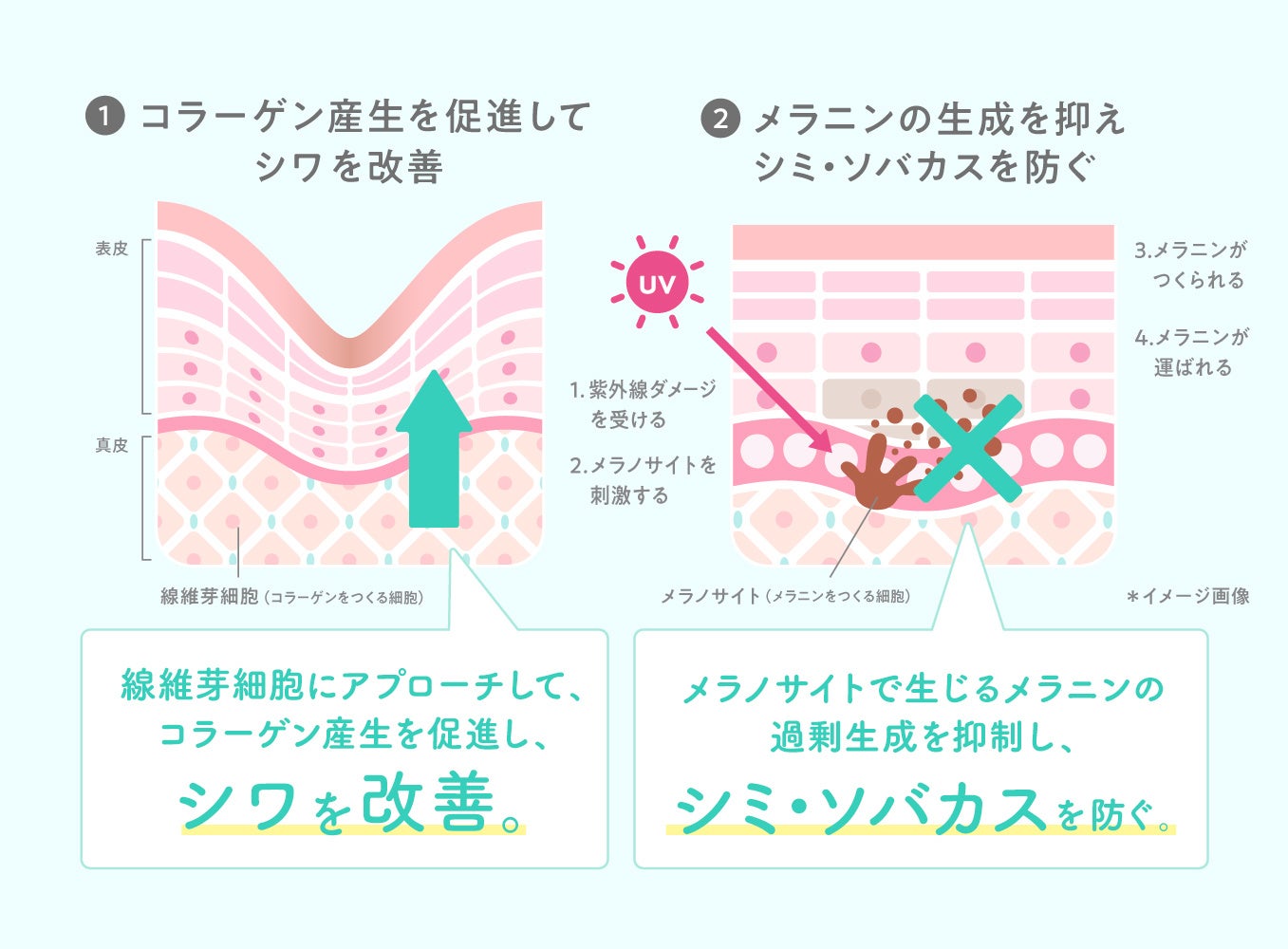 ※1 水を含む ※2 角層まで ※3 メラニンの生成を抑え、シミ・そばかすを防ぐ