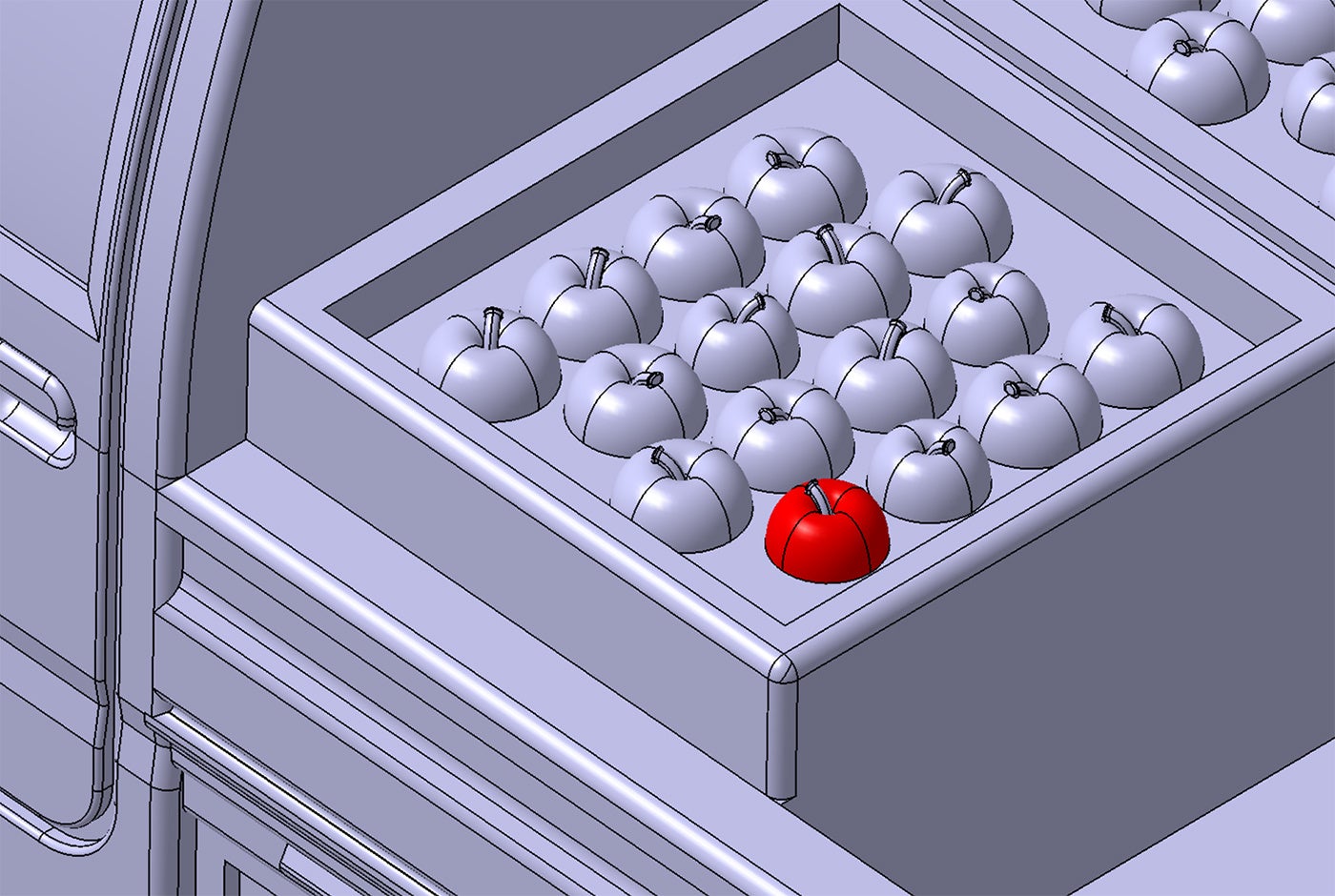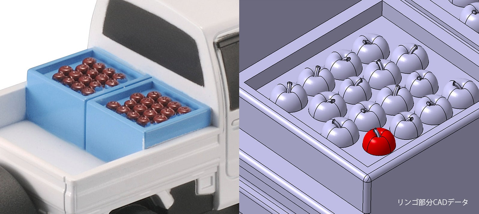 軽トラ定番のホワイトカラーを採用。荷台には働くクルマとしてリンゴを積載し、軽トラらしさを演出しています。(3CADデータ参照:実物はここまで詳細な表現は出来ておりません)