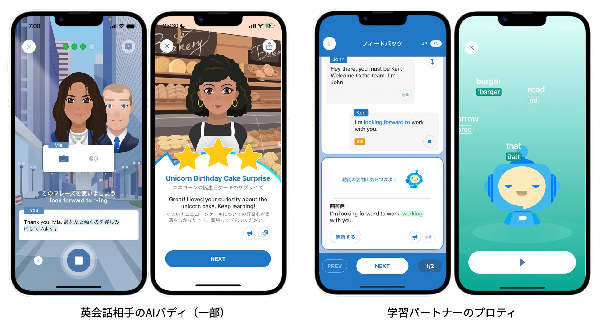 2016年9月にリリースした日本発のAI英会話アプリ。第二言語習得理論と最新鋭のAIを組み合わせた画期的な学習体験を提供しており、感情表現豊かなキャラクター(AIバディ)との対話を通じて、体系的に発音やフレーズ、単語、イディオムなどを学びます。