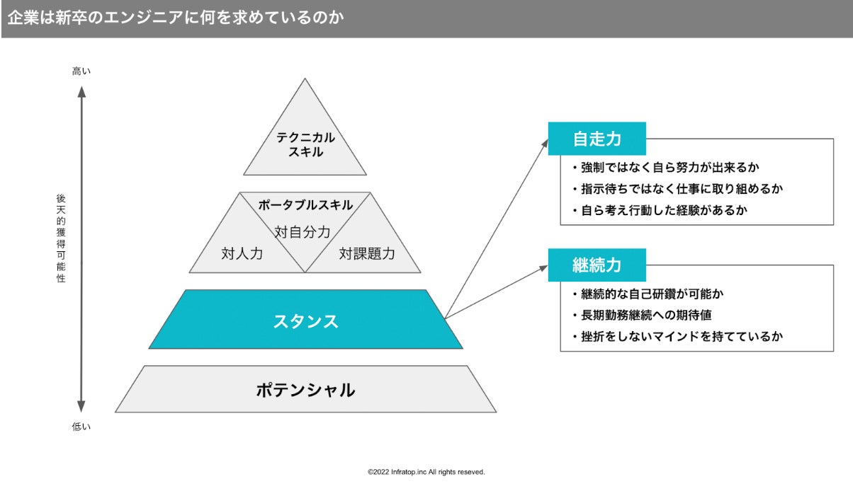 当コースでは、「プログラミング学習をやりきる力」や「入社後のキャリア像・キャリアプランを明確にする力」を学ぶことで活躍人材としてのスタンスを身に着けることができ、入社後のITエンジニアという職種に対するイメージのギャップの発生を起こさせず、自ら考え行動できる人材をより多く輩出することを可能にします。