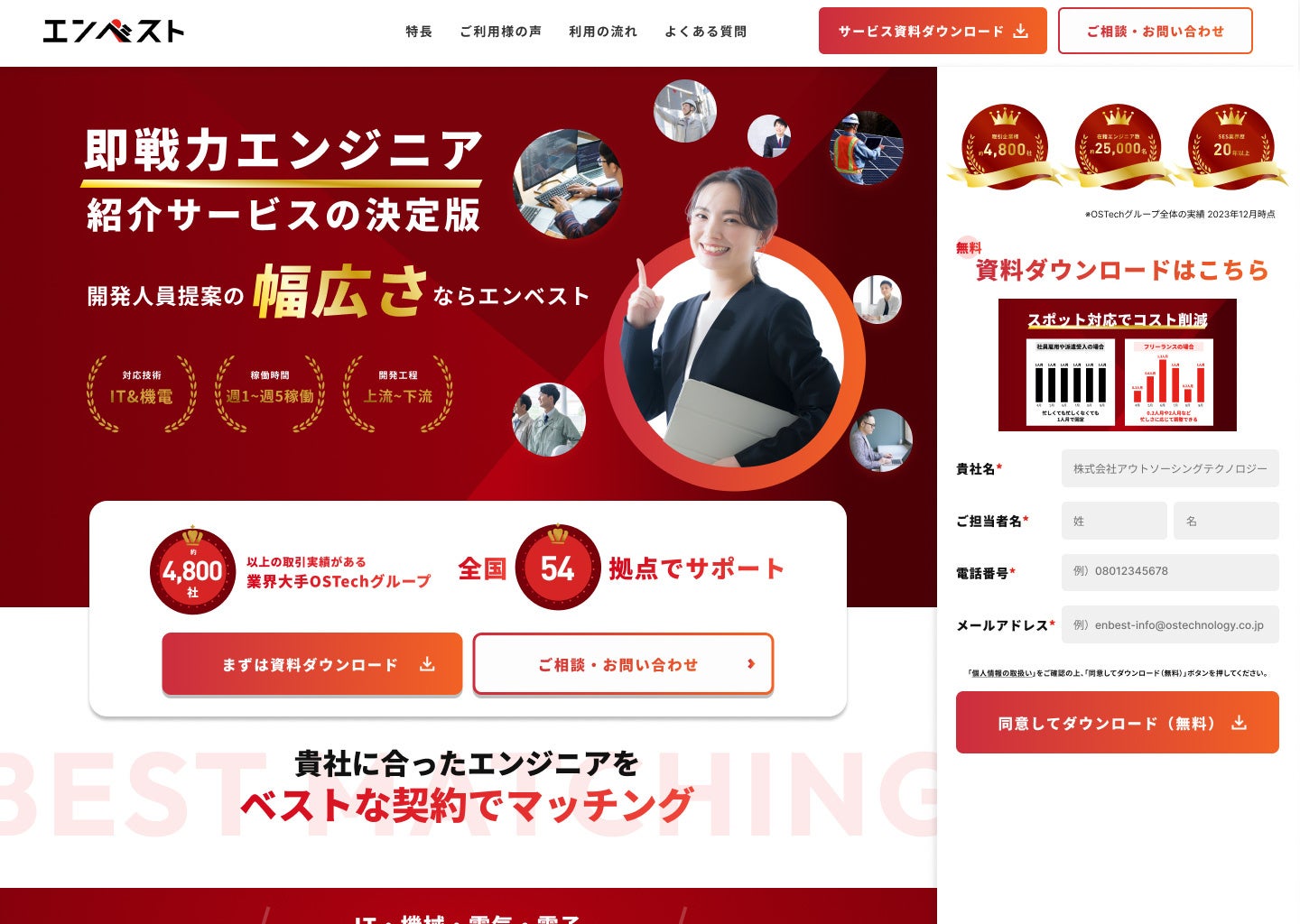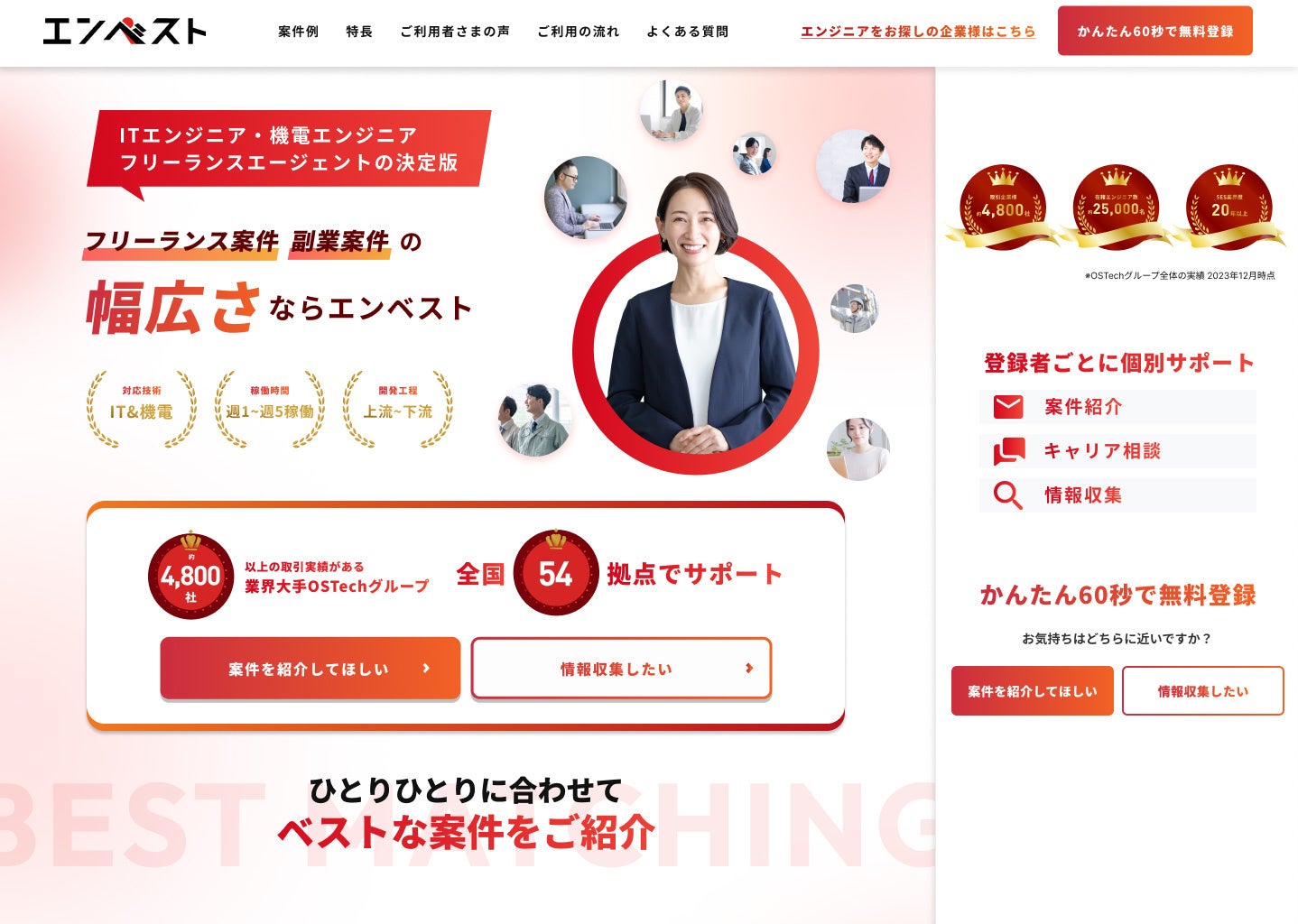 取引企業数4,800社超え、技術系人材派遣支援において多数の実績を持つOSTechが運営しており、企業とエンジニアのマッチングから、日々の進行までを支援。