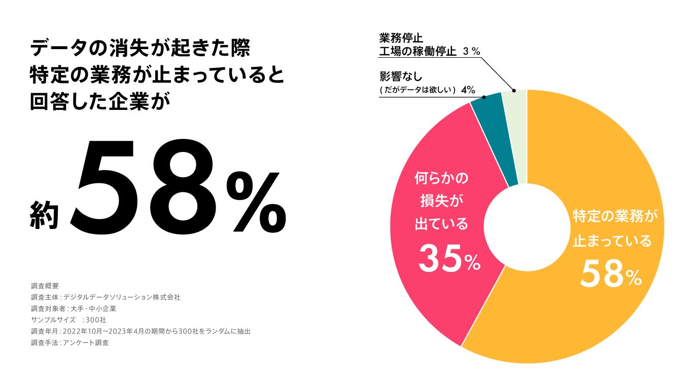 また、約58%の企業がデータ消失の際に業務に支障をきたすなど、データ消失には甚大な実害が発生することが分かります。被害を最小限にするために、事前のデータバックアップと、いざというときの迅速なデータ復旧が重要と言えます。