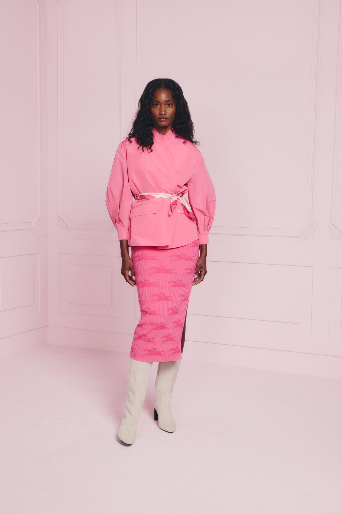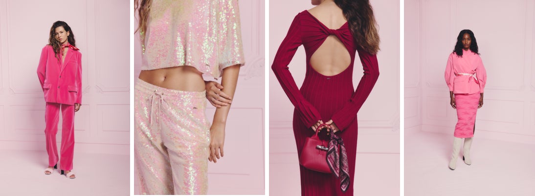 ショッキングピンクのベルベットスーツ(Look 3)、ピーチスキンのような肌触りのストレッチレザー製ストレートパンツ(Look 6, 7)、リサイクルポリエステル製フェイクファーのブルゾン(Look 4, 12)、スパンコール付きのパジャマセットアップ(Look 8)、踊りだしそうなバレエシューズ(Look 6, 7, 8)など、目を惹くテクスチャーとシェードのピンクが揃います。また心が通じ合うかのように、ふわふわフェイクファーの「ル ロゾ コージー」(Bag 6)や、ロゼ・シャンパーニュの泡のようにキラキラした「ル プリアージュ® パイエット」、トーンオントーンの「ル プリアージュ® ピンク」が華やぎをもたらします。