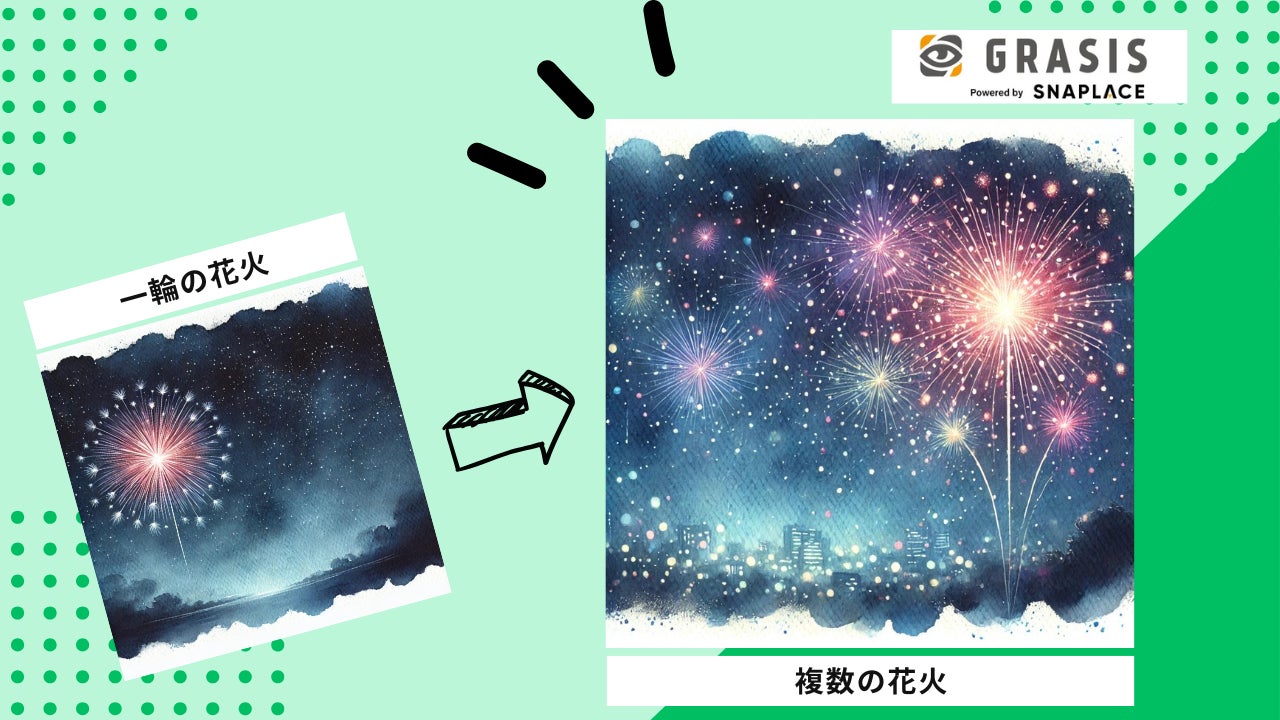 花火…一輪の花火よりも、複数の花火が同時に打ち上げられたショット