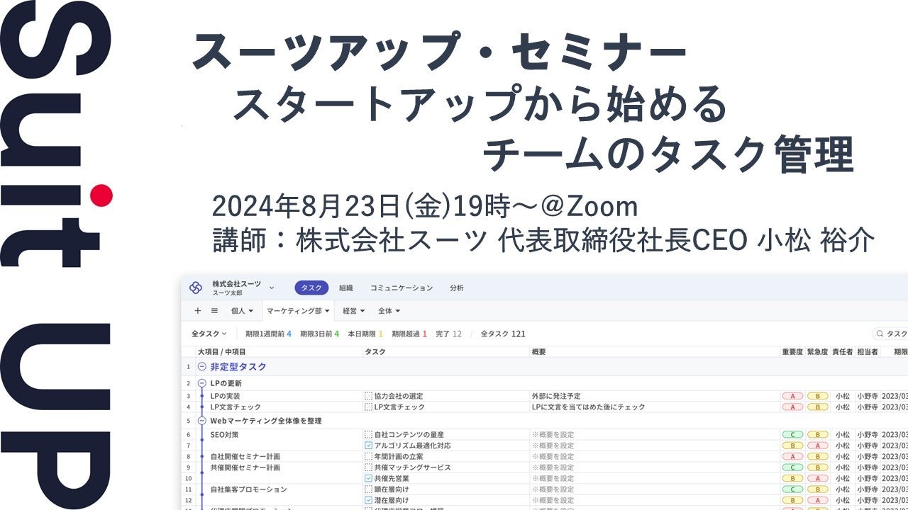 株式会社スーツ(所在地:東京都千代田区、代表取締役社長CEO:小松 裕介)は、2024年8月23日(金)19時から、当社代表の小松が講師を務めるスーツアップ・セミナー「スタートアップから始めるチームのタスク管理」を無料開催します。