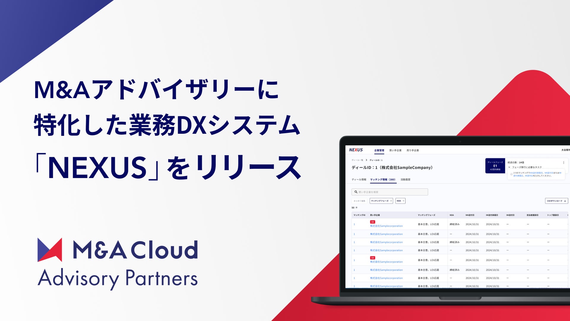 株式会社M&Aクラウド(本社:東京都千代田区、代表取締役CEO:及川厚博、以下「当社」)は、M&Aアドバイザリー業務向けのDXシステム「NEXUS」を開発しました。これにより、アドバイザリー業務の効率化を実現し、大幅な時間短縮とマッチング率、成約率の向上を図ります。