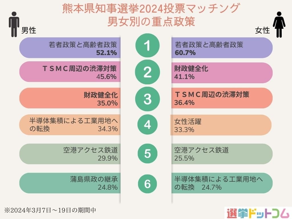 利用者のうち熊本県内在住の18歳以上の男女に絞って、重点政策の回答状況をまとめたのがこの図です。男女ともに上位6位のうち5項目が共通していました。