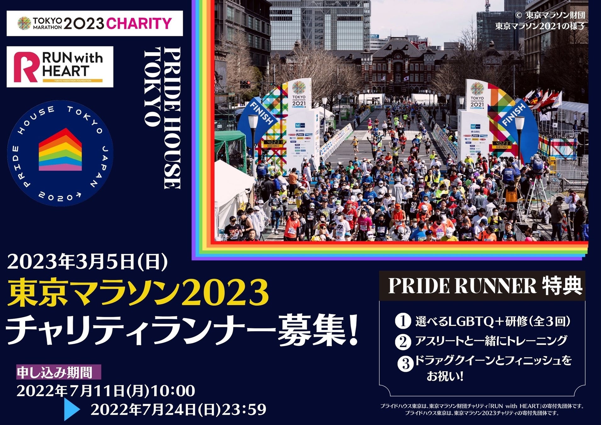 プライドハウス東京(事務局:グッド・エイジング・エールズ)は、東京マラソン財団チャリティ「RUN with HEART」の寄付先団体として、2023年3月5日(日)に開催される「東京マラソン2023」に出場するチャリティランナーを120名募集します。ランナーの皆さんには特典として、選べるLGBTQ+研修やアスリートとの事前合同トレーニングにもご参加いただけます。