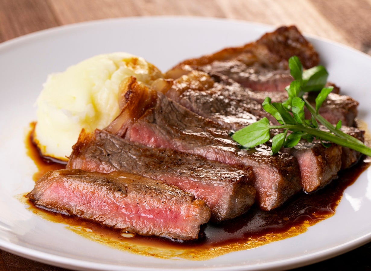 ミディアムレアに焼き上げたサーロインステーキと自家製グレービーソースを合わせた一品。コク深いバター香るマッシュポテトと合わせてお召し上がりいただけます。