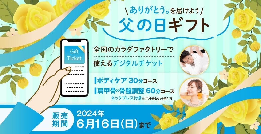 今回販売開始となる「ありがとう。を届けよう/父の日ギフト」は、カラダファクトリーの整体師による健康ケアを贈ることができる、デジタルGIFTチケットで、全国のカラダファクトリーでご利用いただけます。
