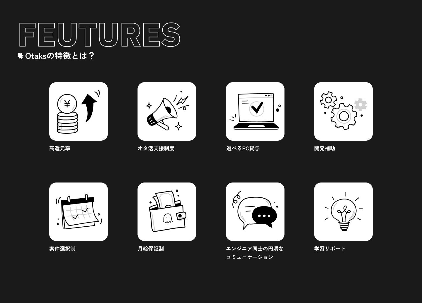 そこで私たちOtaksは「オタクがウズウズ働ける世の中をつくる」ことをミッションに掲げ、世のオタクエンジニアが「オタク気質」を存分に発揮できる環境を整えていきます。